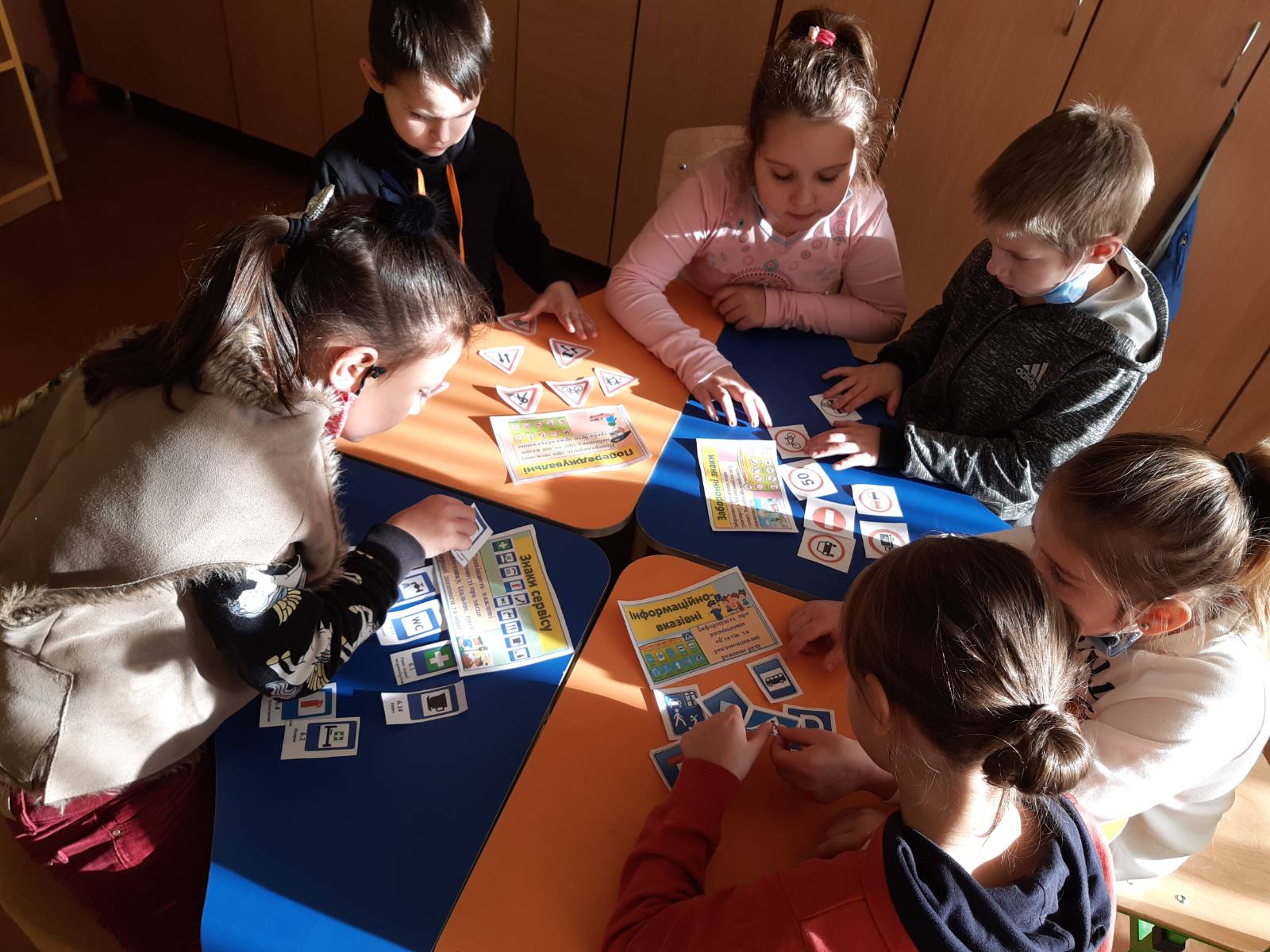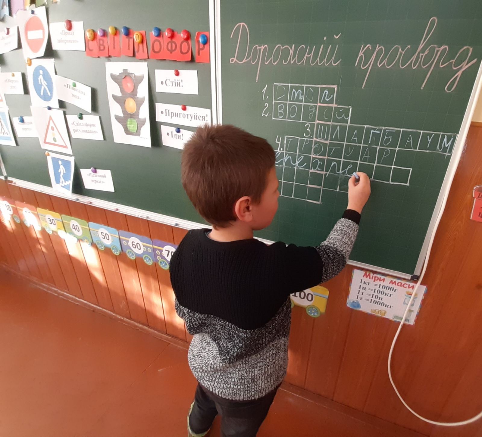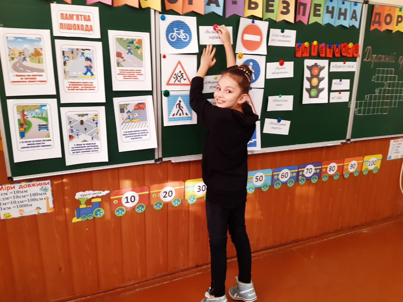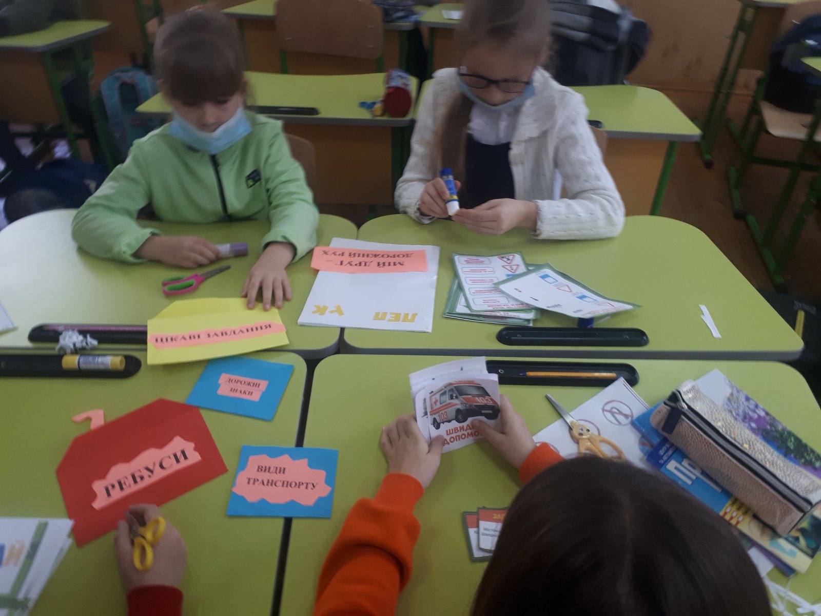 А малеча 4- Б класу, об'єднюючись у локації, узагальнила та систематизувала знання про безпеку на дорозі , виконуючи різні завданння : знайти зайвий дорожній знак у рядку; з'єднати дорожній знак із назвою, контур знака з малюнком, розгадували ребуси.